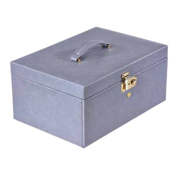 Joyero de Pierre Cardin tamaño grande fabricado en PU y grabado coco. cierre de tapa con asa de mano y cerradura con llave. Espejo interior, bolsillo. Caja independiente extraíble para viaje.  5 cajones con diferentes tamaños. Diferentes departamentos para pequeñas joyas. Interior aterciopelado. Medidas: 35,5 (largo) cm 17 (ancho) x 26 (alto) cm