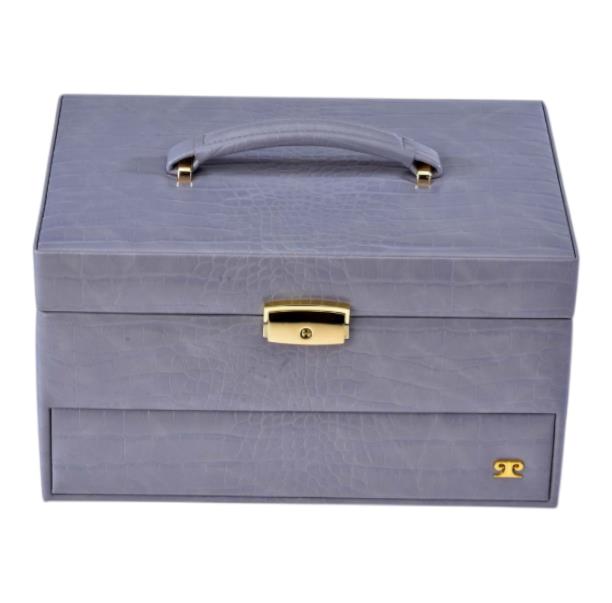 Joyero mediano Pierre Cardin fabricado en P.U grabado coco. Cierre con tapa, cerradura de llave y asa de mano. Espejo interior y bandejas articuladas con compartimentos para diferentes tamaños de joyas. Interior aterciopelado. Medidas: 15 (ancho) x 19 (alto) x 27 (largo) cm