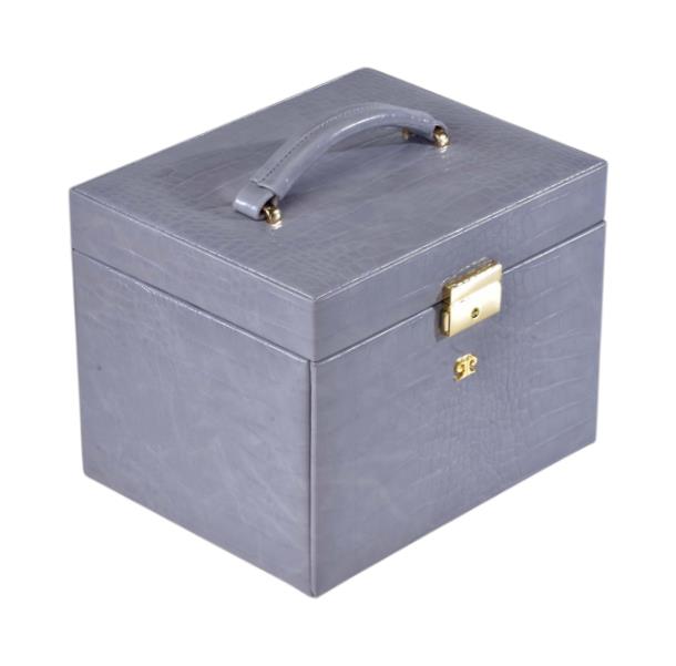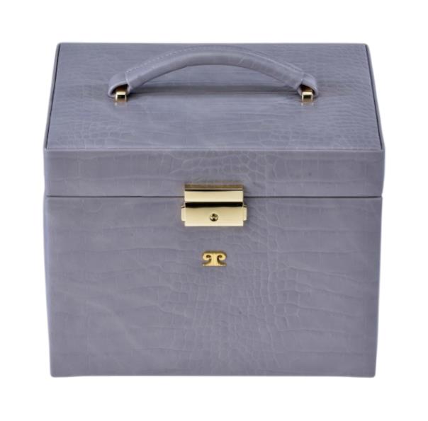 Joyero mediano Pierre Cardin fabricado en P.U grabado coco. Cierre con tapa, cerradura de llave y asa de mano. Espejo interior y 3 cajones para diferentes tamaños de joyas. Interior aterciopelado. Medidas: 22 (ancho) x 17.5 (alto) x 17.5 (fondo)