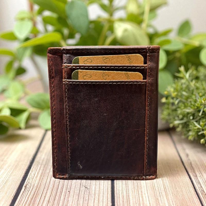 Billetero/Tarjetero con bordados argentinos en piel de vacuno engrasada. Cierre mediante broche. Dispone de 2 compartimentos para billetes, seis ranuras para tarjetas y 2 ventanas para documentos. Sistema RFID para la protección de tarjetas. Medidas: Alto 10.5cm Ancho 8cm. Fondo 1.5cm