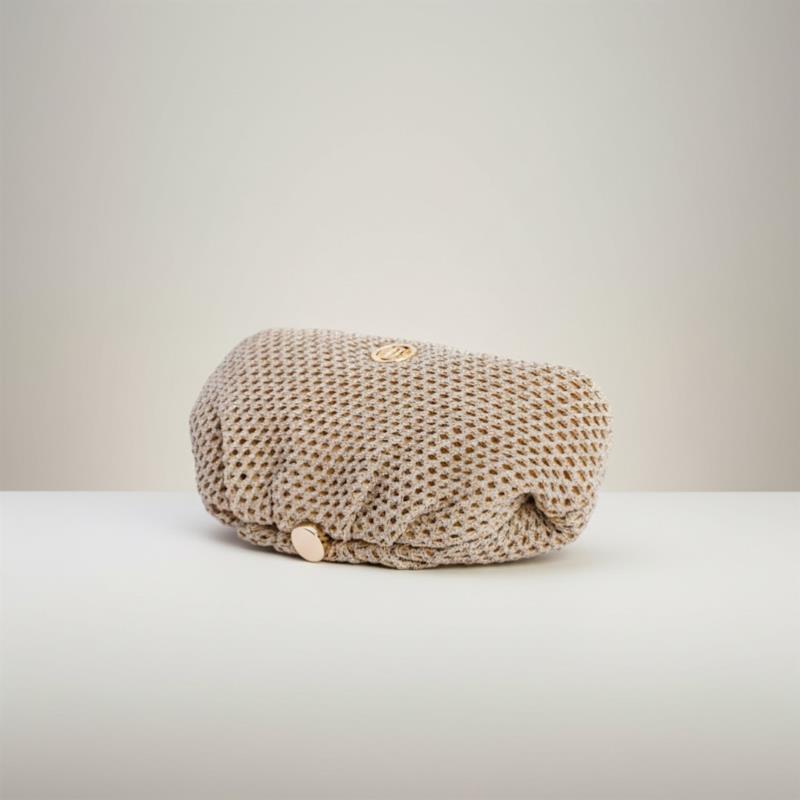 Bolso de fiesta en malla tejida con fondo beige e hilo dorado. Cierre de boquilla metálica. Logo marca en el frontal. Dispone de una asa bandolera de cadena metálica. bolsito de cremallera. Medidas 26 x 6 x 14 cm.