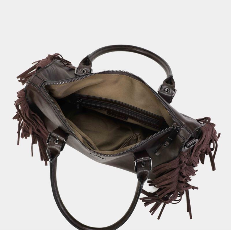 ¡Uno de los bolsos más trendy de esta temporada! Muestro bolso de mano Kate esta fabricado en está en pu y antelina en los flecos de alta calidad. Es un bolso muy versátil, ya que te servirá para el día a día o para ocaciones más especiales. Asa ajustable en su interior y con detalles metálicos de color nickel. ¿Te vas a quedar sin él?. Medidas Alto: 25 cm Ancho:37 cm Fondo:14 cm