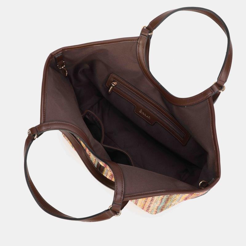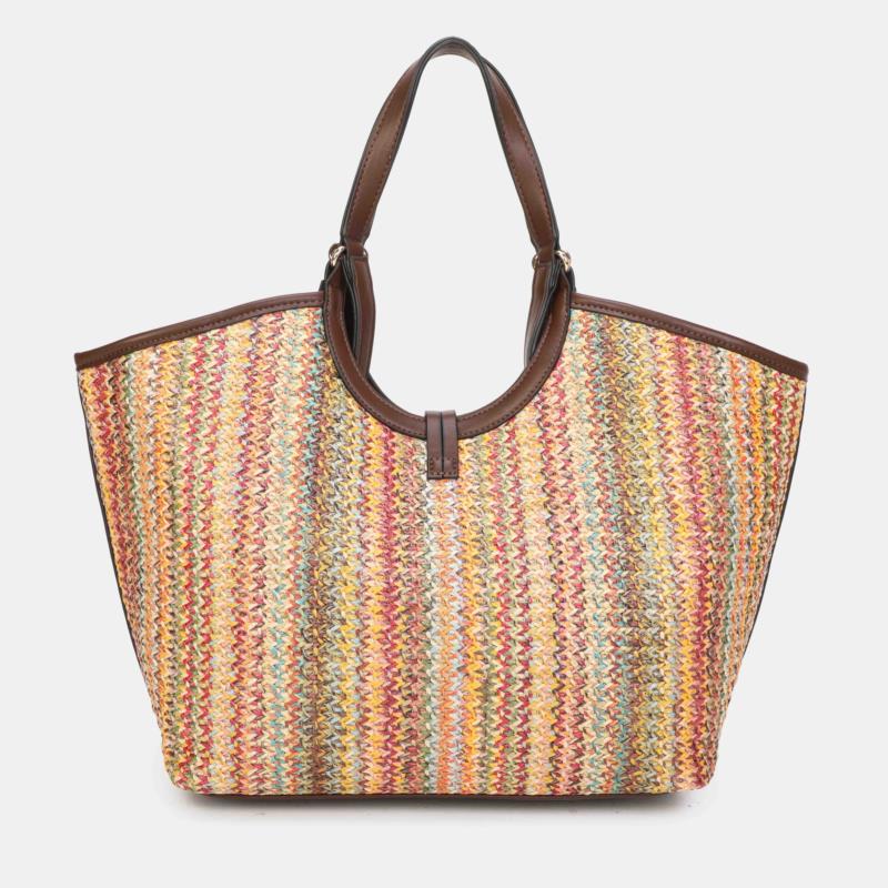Bolso de mano Lina confeccionado en rafia. Tiene dos posiciones; mano y bandolera, asa ajustable en su interior. Encontramos diferentes bolsillos, uno de ellos con cremallera. Los detalles metálicos son de color oro claro. Medidas Alto:29cm Ancho: 44cm Fondo:13cm