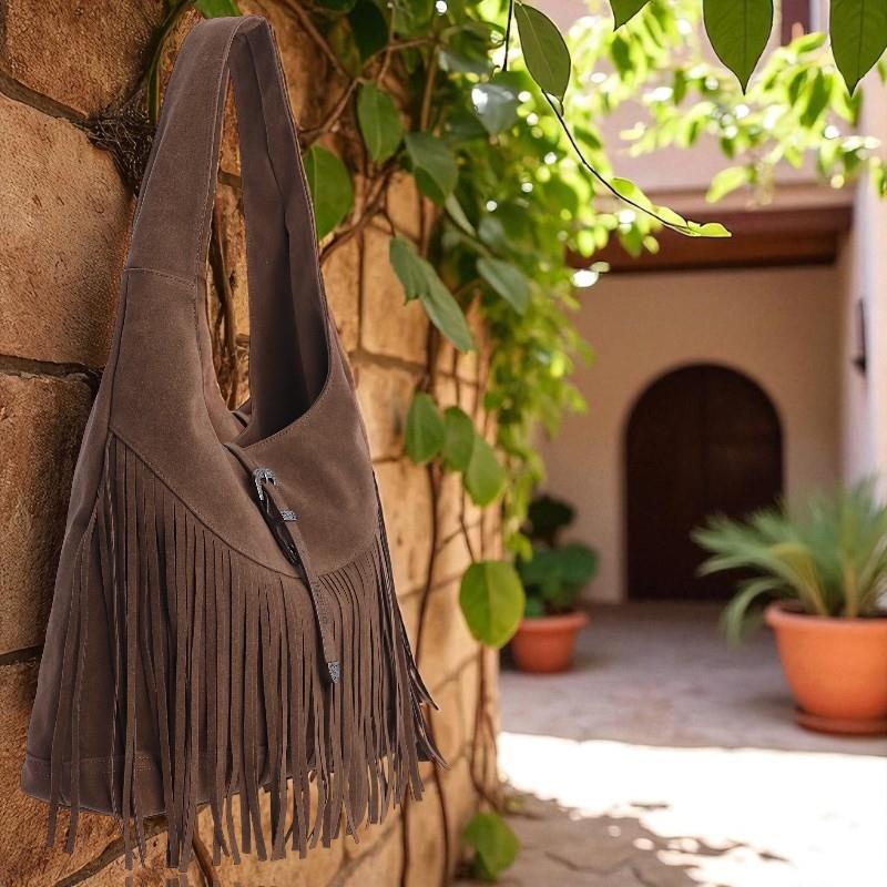 Bolso de hombro góndola Estilo Boho Chic con flecos y acabado efecto ante. Cierre central de cremallera. MEDIDAS: ANCHO 36CM X ALTO 29CM X FONDO 10CM.