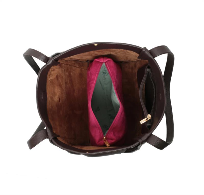 Bolso shopper pu grano color Marrón, 2 asas de hombro y cierre con clips de imán, 1 bolso organizador interior extraíble + bolso de cremallera.