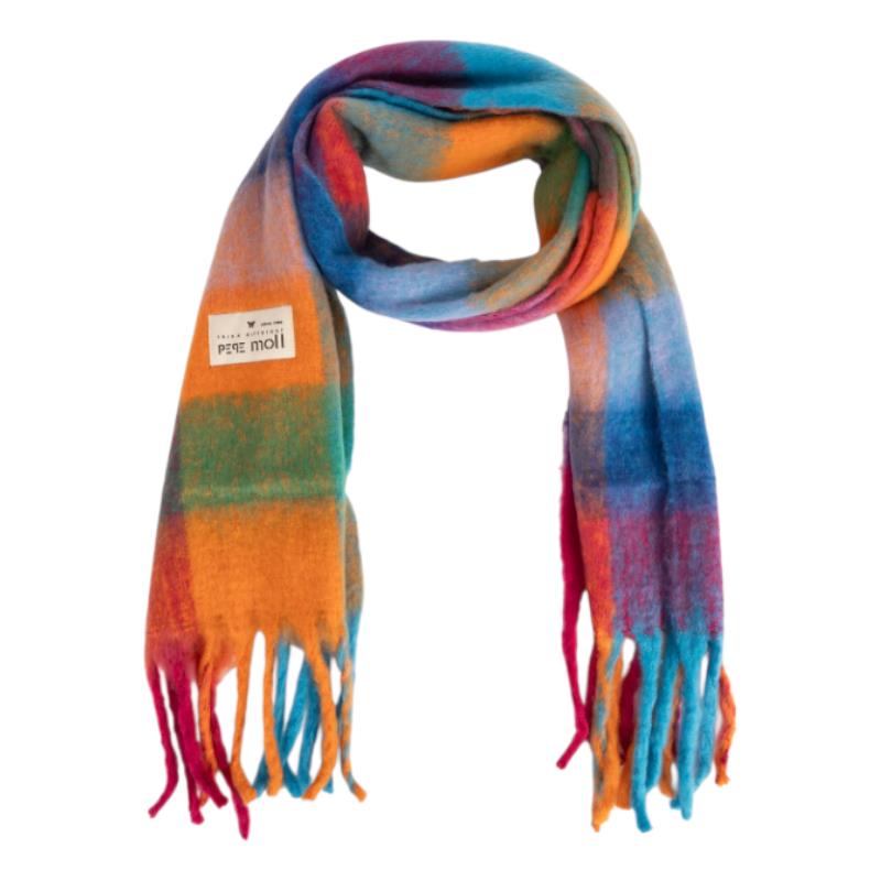 Esta bufanda multicolor 252821 oversize combina calidez y actitud en un diseño de cuadros grandes con una paleta vibrante. Su mezcla de tonos vivos y tejido afelpado la convierten en el toque de color perfecto para transformar cualquier outfit invernal. ? Estampado plaid en cuadros grandes ? Colores llamativos: fucsia, naranja, azul, verde y morado ? Tejido grueso y ultrasuave tipo mohair ? Flecos largos multicolor ? Detalle de marca con sello Pepe Moll