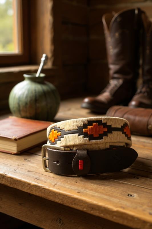 Cinturón Argentino confeccionado en piel de vacuno de primera calidad. Bordado con cordel de algodón encerado en varios tonos. Hebilla metálica. Grabado en puntera. Ancho: 35mm