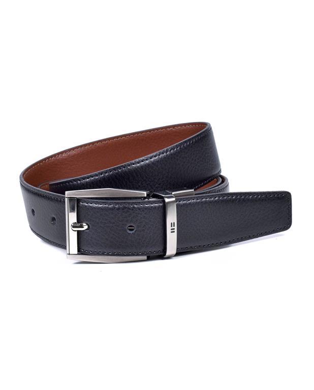 Cinturón reversible Negro/Cuero en piel de vacuno legitima. Ancho: 32 mm. Hebilla en acabado Nickel negro satinado. Made in Spain.