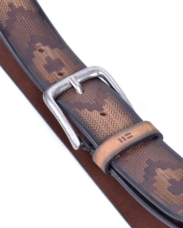 Cinturón en piel de vacuno. Ancho 40 mm Ajustable Piel Legítima Hebilla níquel negro satinado. Logotipo y motivos étnicos grabados sobre la piel. Composición:100% Piel vacuno