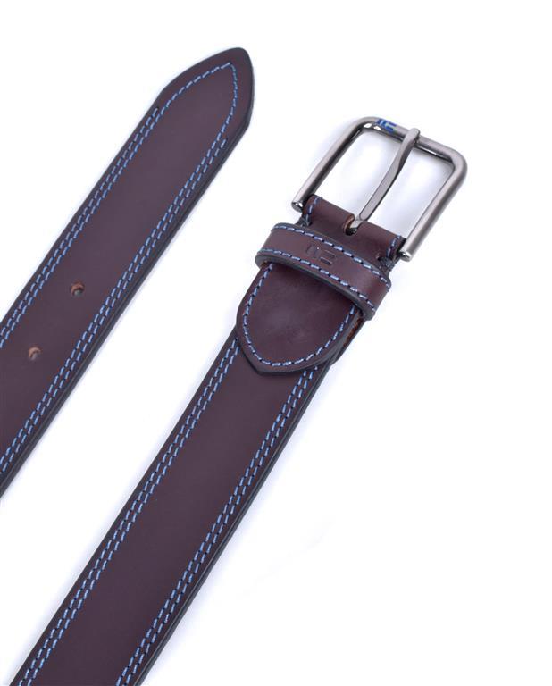 Cinturón en piel de vacuno 100%. Ancho: 35 mm Piel legítima. Pespunte Azul a contraste. Hebilla con logo grabado en níquel satinado.