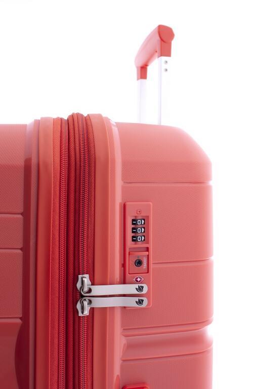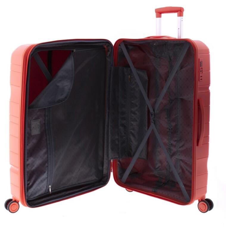 Maleta grande con cuatro ruedas dobles con suspensión. Cierre TSA incrustado en el lateral. Asa superior y asa lateral. Cremallera Extensible. Mecanismo barra con botón. Componentes al tono. Interior forrado con bolsillos y soporte de cintas elásticas en ambos lados. Fabricada en Polipropileno, Material súper resistente. Medidas: 53x77x29/32 cm Volumen: 105/115 L