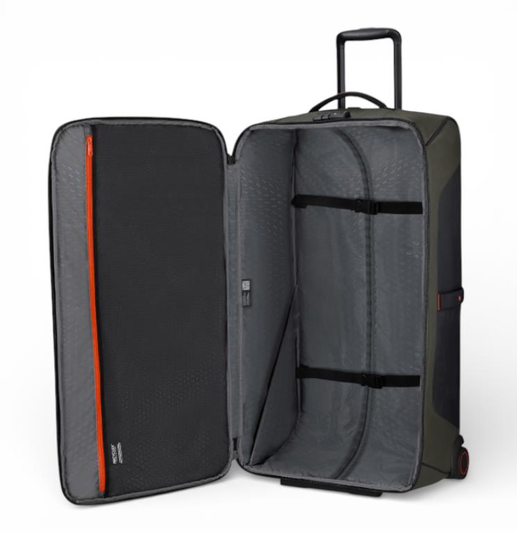 Ecodiver establece un nuevo estándar dentro de nuestra gama casual. Esta colección combina practicidad con un diseño elegante y ha sido desarrollada con especial atención a la seguridad y comodidad. Utilizando materiales reciclados, Ecodiver encaja perfectamente en nuestra estrategia de "Viaje responsable". El revestimiento resistente al agua hace de esta gama la elección perfecta para todas tus aventuras al aire libre y tus interminables paseos por la ciudad. Bolsa de viaje con ruedas Color Negro Dimensiones 79 x 44 x 31 cm .Maleta de cabina Volumen 122 L Peso 3.4 kg. Candado de combinación con función TSA Cremalleras. Tirador Doble tubo Ruedas 2 ruedas Sistema integrado Bolsillos exteriores Compartimento frontal de fácil acceso con forma de C Equipaje de mano. Etiqueta para dirección Etiqueta de identificación integrada Detalles reflectantes. Asa inferior. Compartimiento central.