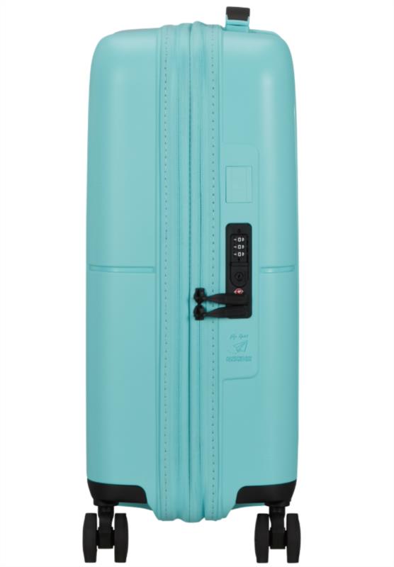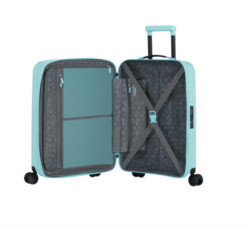 Fabricada en Material 100% Polipropileno. Dimensiones 55 x 40 x 20 cm. Dimensiones ampliadas 55 x 40 x 23 cm Tamaño Maletas de cabina Volumen 41/47 L Peso 2.5 kg  Exterior. Cerradura TSA Cremalleras. Asa superior, Tirador Doble tubo. 4 Ruedas Dobles.  Expansible. Separador interno. Material Tejido interior fabricado con 13 botellas de PET recicladas utilizando nuestra tecnología de materiales Recyclex™ Cintas cruzadas.