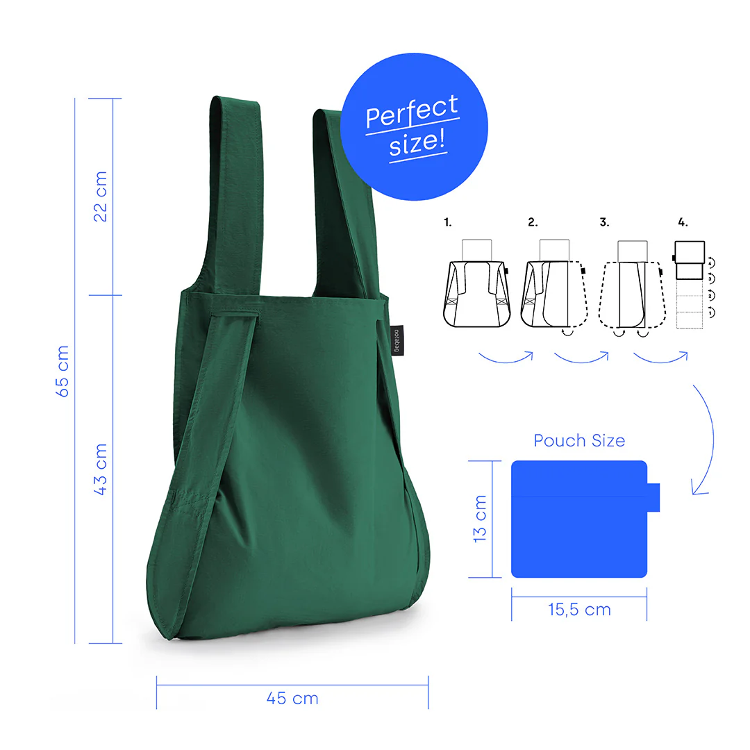 Notabag es la combinación inteligente de un bolso y una mochila. Se transforma con un solo tirón de las correas, para que puedas ponértelo en la espalda y tener las manos libres. En el interior del bolso hay un bolsillo adjunto donde puedes guardar la cartera o las llaves. Cuando no uses el bolso, se pliega en ese bolsillo y se convierte en un bolso del tamaño de una mano. Este elegante bolso ecológico cambia las reglas, adaptándose a la vida cotidiana; práctico y flexible como ningún otro. Al comprar este producto, contribuyes a nuestra donación 1% for the Planet. Especificaciones – Tamaño: 45×65 cm – Tamaño de la bolsa: 13×15,5 cm – Mezcla de algodón y nailon anti desgarro – Reutilizable/ecológico – Resistente al agua – Lavable a máquina