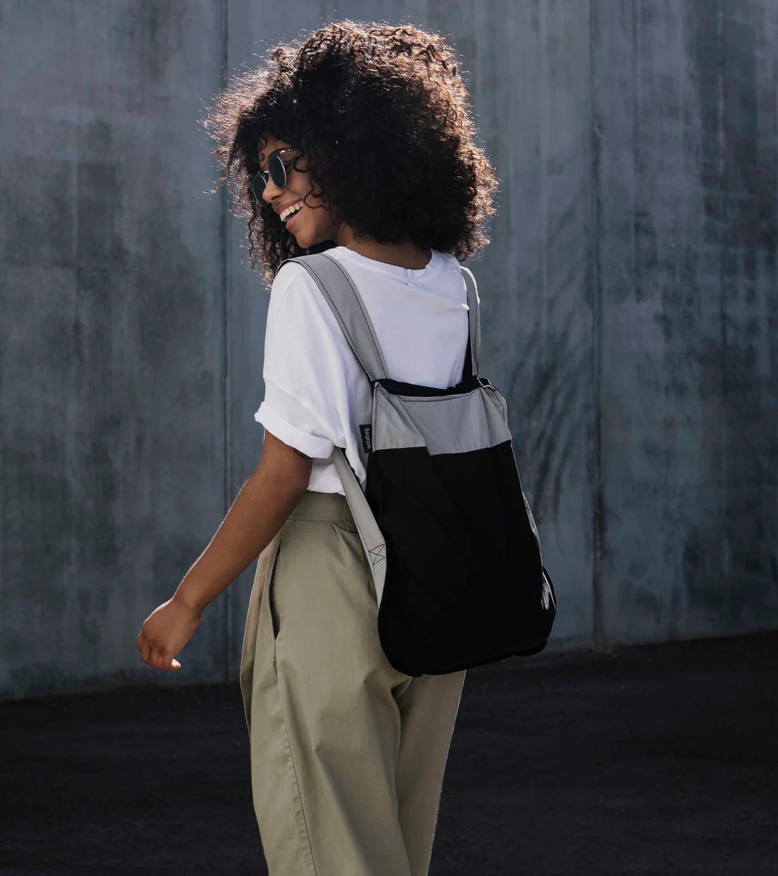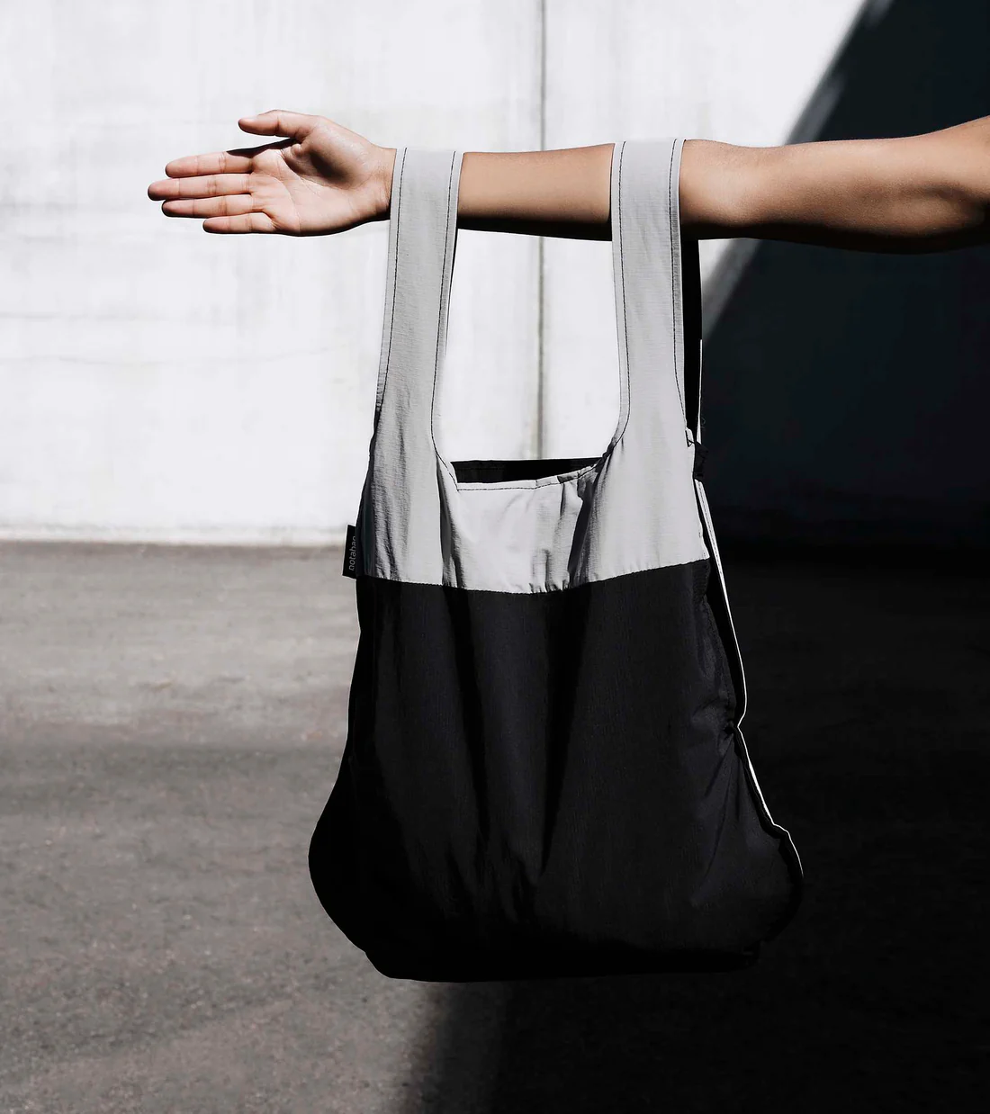 Notabag es la combinación inteligente de un bolso y una mochila. Se transforma con un solo tirón de las correas, para que puedas ponértelo en la espalda y tener las manos libres. En el interior del bolso hay un bolsillo adjunto donde puedes guardar la cartera o las llaves. Cuando no uses el bolso, se pliega en ese bolsillo y se convierte en un bolso del tamaño de una mano. Este elegante bolso ecológico cambia las reglas, adaptándose a la vida cotidiana; práctico y flexible como ningún otro. Al comprar este producto, contribuyes a nuestra donación 1% for the Planet. Especificaciones – Tamaño: 45×65 cm – Tamaño de la bolsa: 13×15,5 cm – Mezcla de algodón y nailon anti desgarro – Reutilizable/ecológico – Resistente al agua – Lavable a máquina
