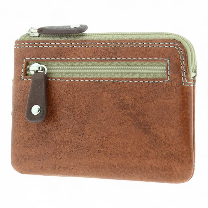 Fabricado en piel vacuno. 4 ranuras para tarjetas + 2 cremalleras. dispone de 2 argollas pata llaves. Dimensiones: 12cm x 8.5 cm