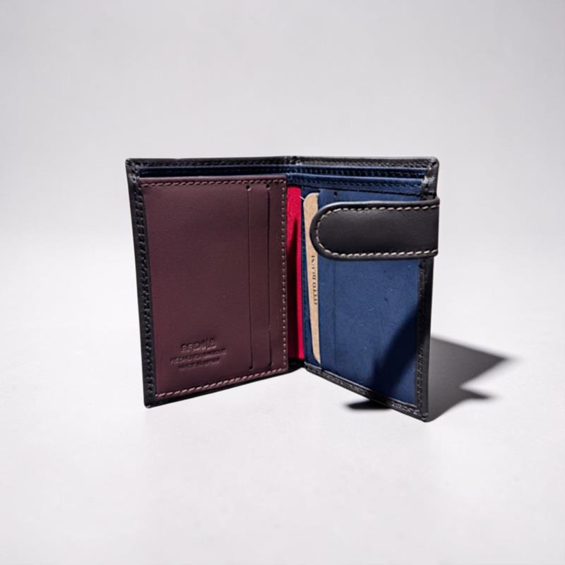 Fabricado en Piel Vacuno. 8 ranuras para tarjetas + ventana DNI. Doble billetero. Monedero exterior. Cierre presilla. Fabricado en España